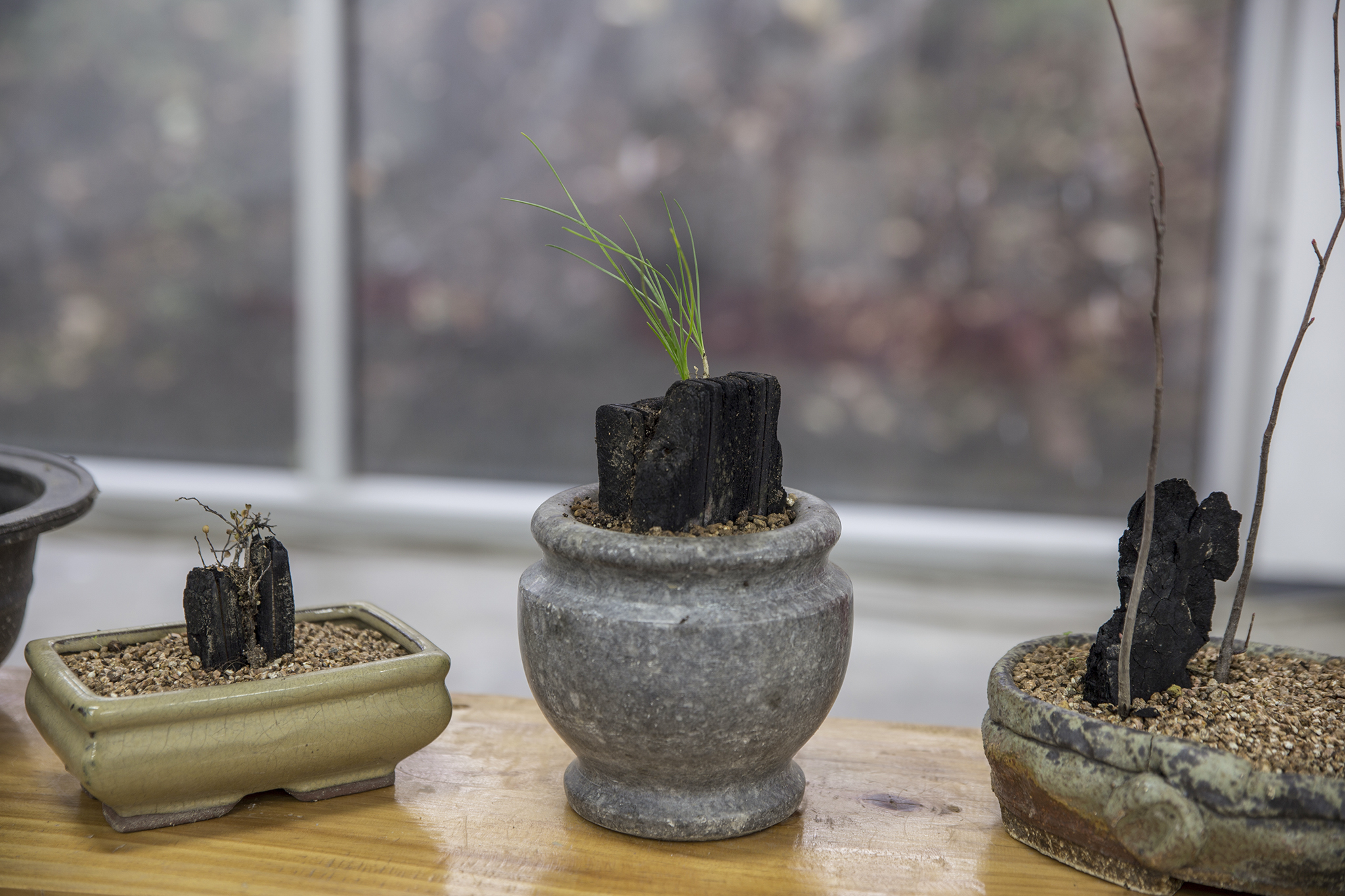分段生死, Cut in Half: Being and Beyond, 2015, Installation, Bonsai with MDF charcol, red fabric