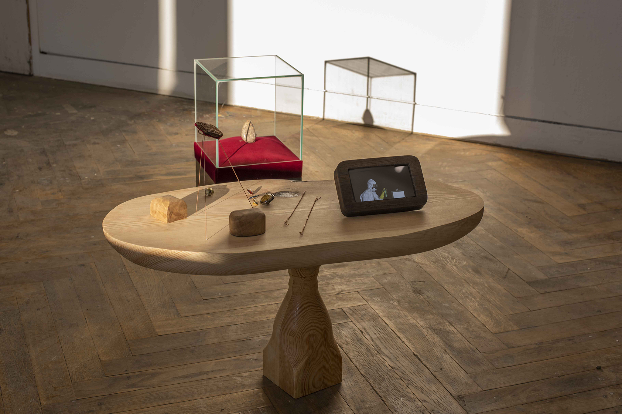 ‘Is a Stone Alive on Velvet?’, 2019, Installation, Materials : A naturalized stone being sprayed with fixative a year ago, velvet, granite, cube glass, copper, dark oak, walnut, pine wood, cotton, buttons, monitor